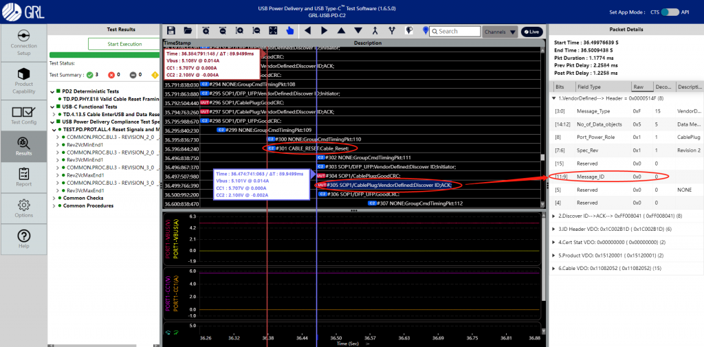 在下圖中,測試儀器GRL-USB-PD-C2,發起電纜重置信號後,Cable回復的Discover ID ACK消息中,MessageID已置0,即協議層MessageIDCounter已重置,同時也可以看到在Cable Reset過程中電源沒有變化。